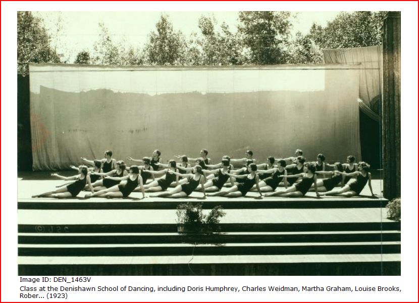 Class at the Denishawn School of Dancing, including Doris Humphrey, Charles Weidman, Martha Graham, Louise Brooks, Robert Graham.